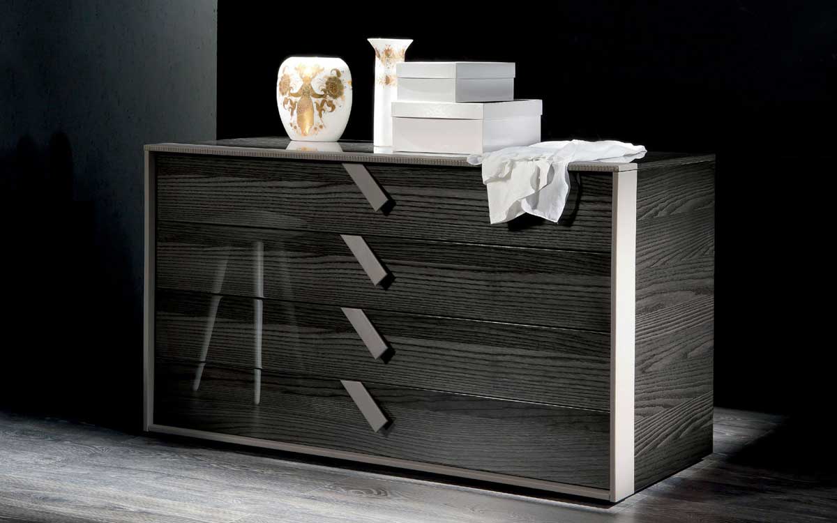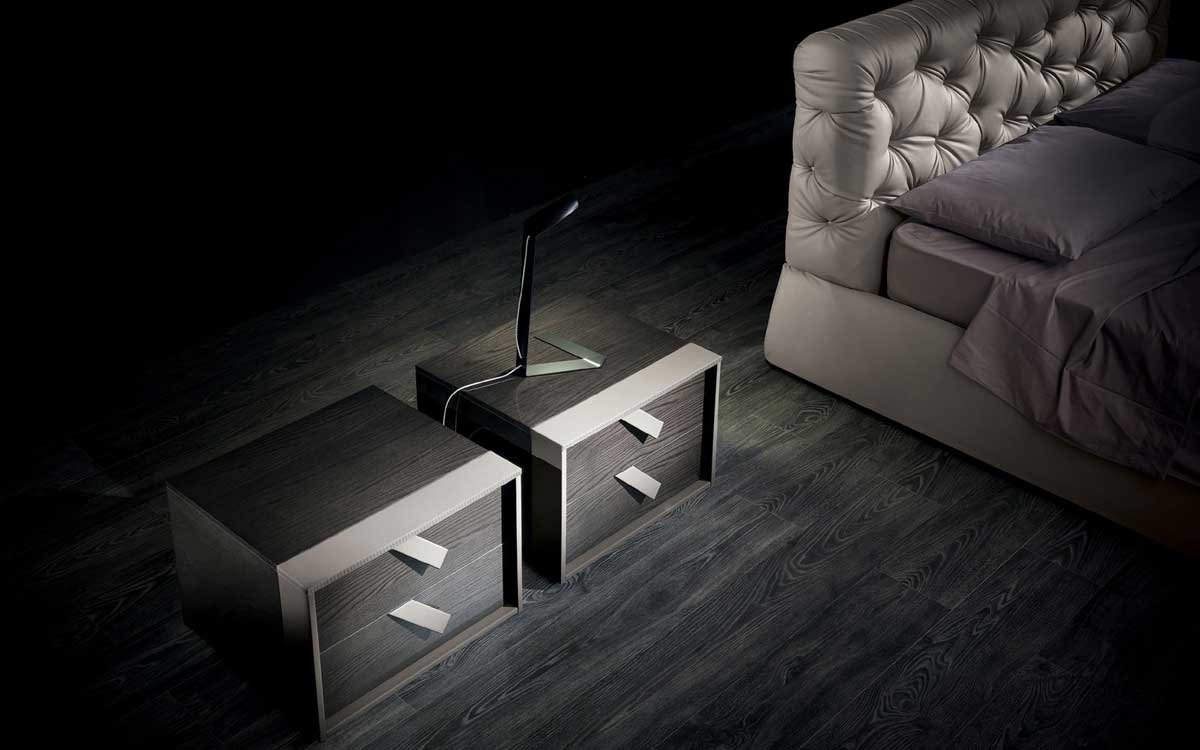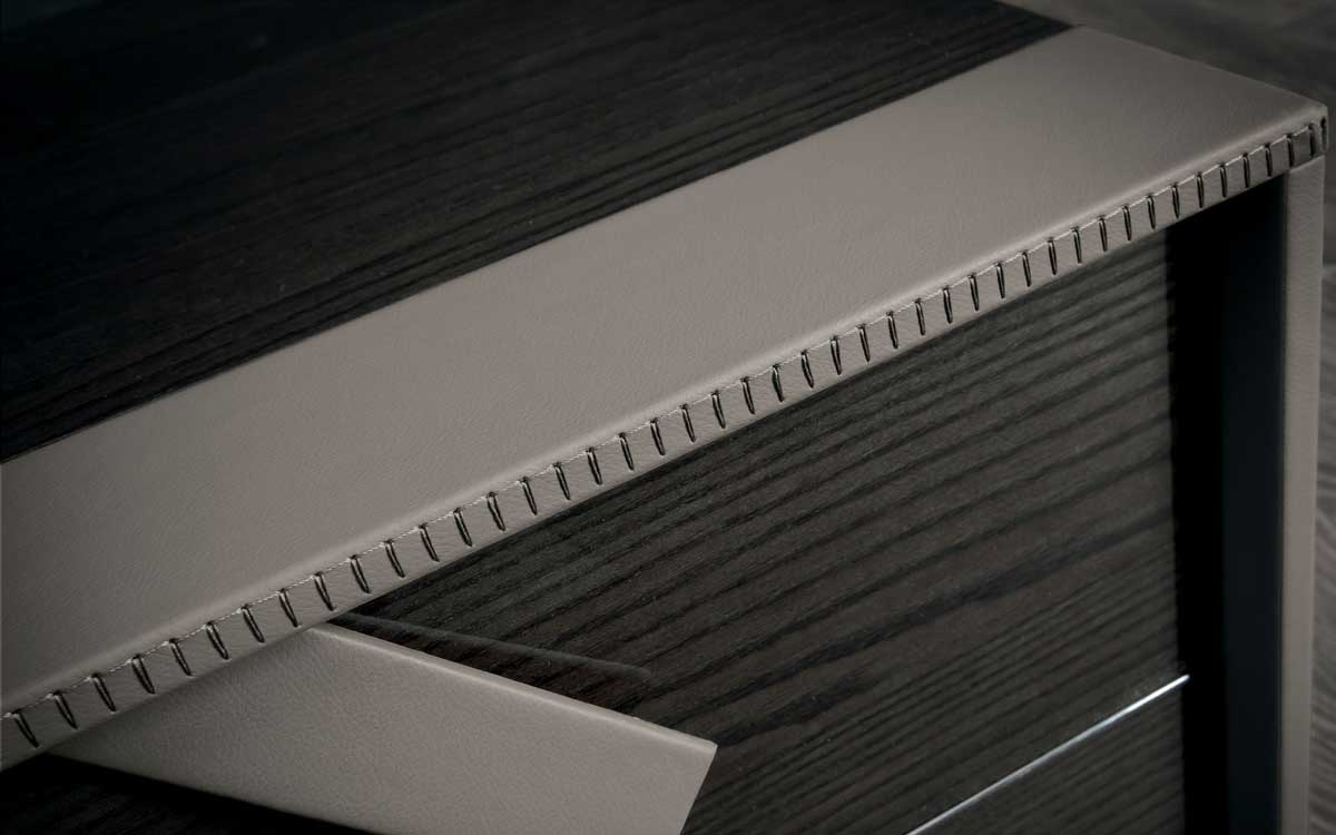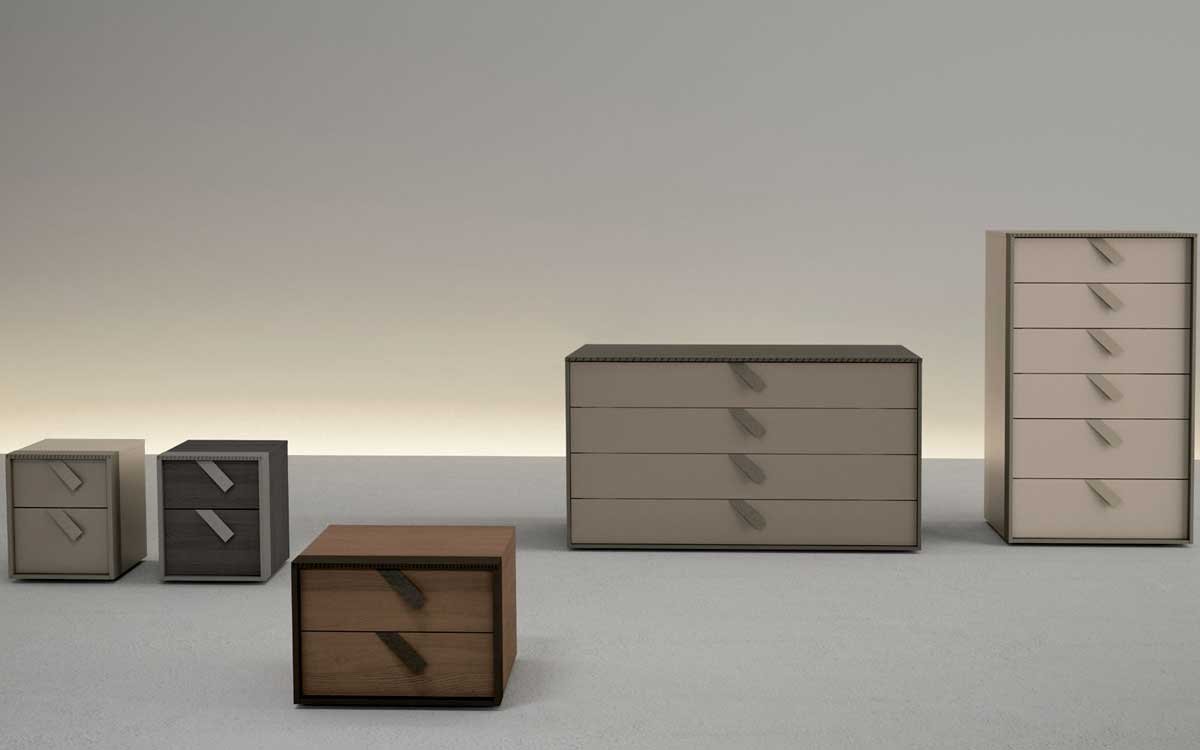 E’ la rappresentazione di un giusto equilibrio tra il rigore estetico ed il piacere della morbidezza dell’ecopelle, espressa dal segno forte e piacevole della maniglia segnale e dal soffice contorno delle forme dei comodini e comò.