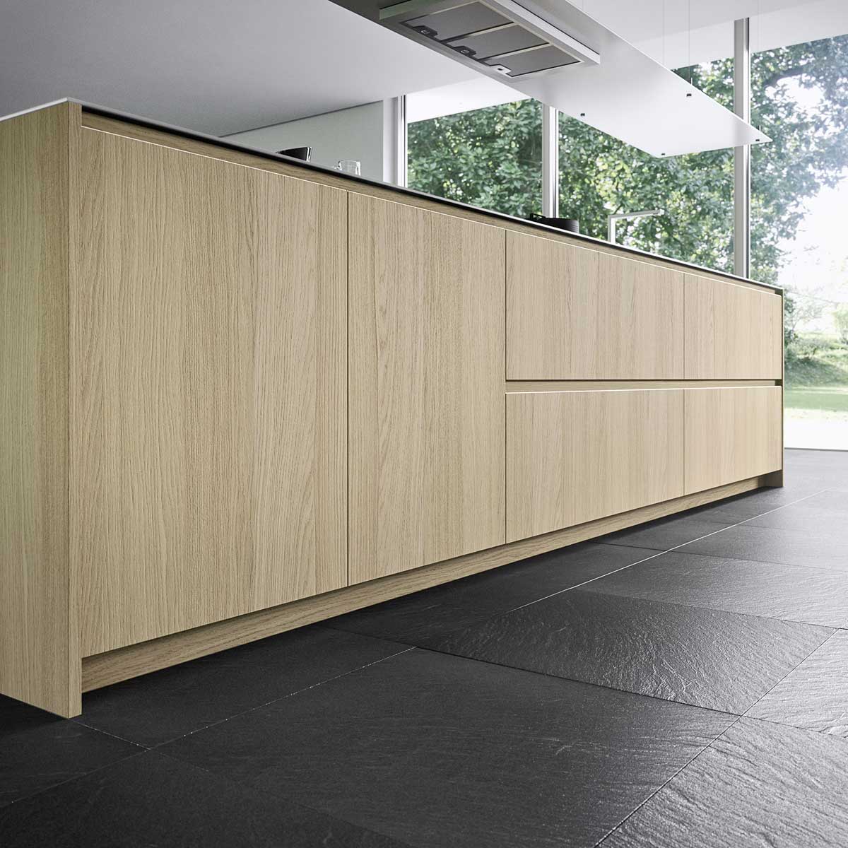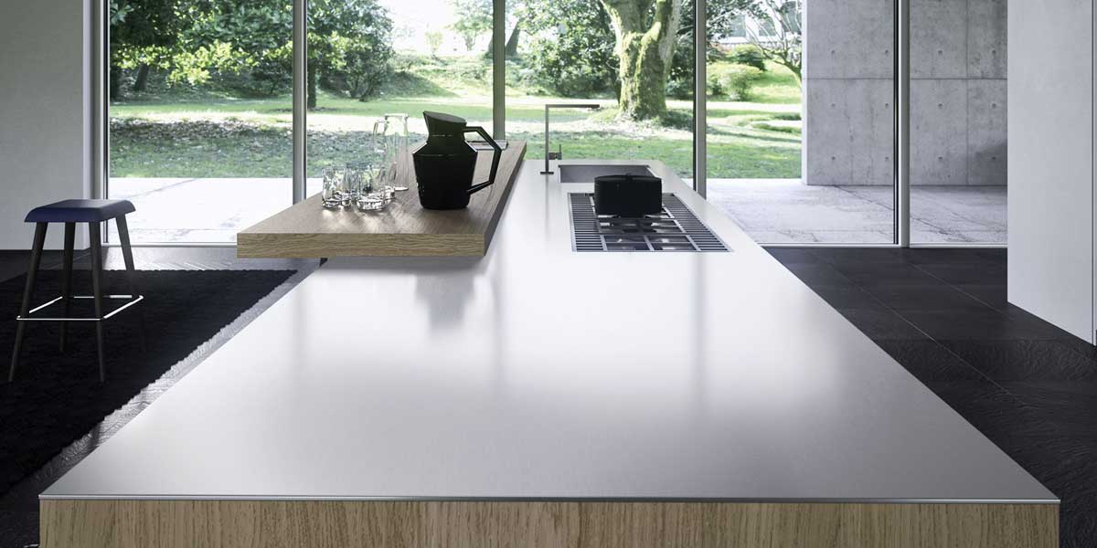 Cucina con blocco isola in finitura rovere nordico, top in finitura acciaio inox sp. 6.