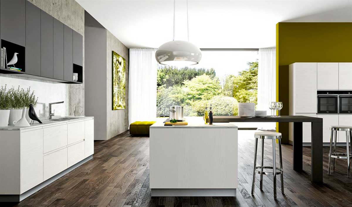 Cucina con maniglia integrata nel pannello in finitura bianco poro aperto.